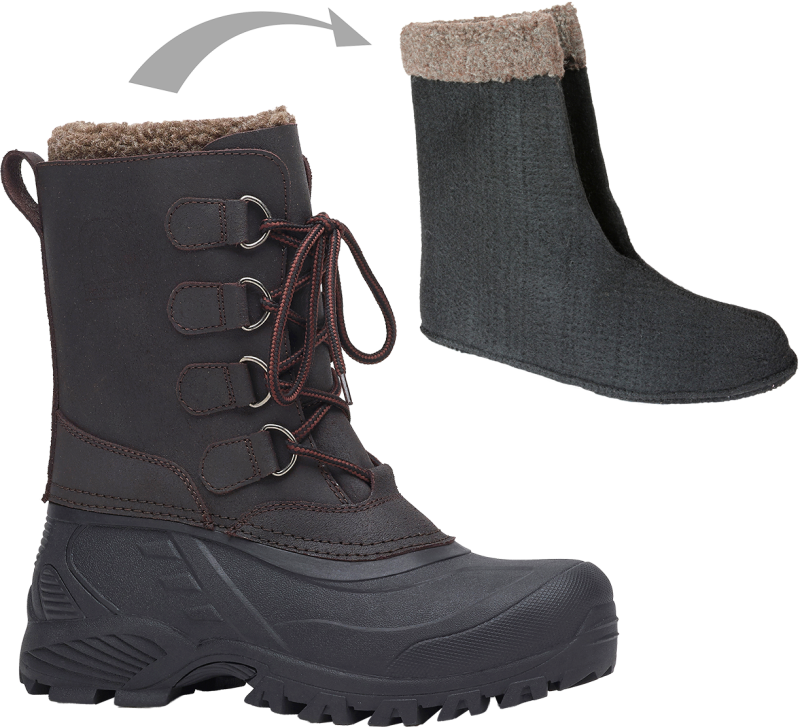 ROUCHETE HUDSON Plus téli csizma kivehető béléssel Robusztus téli csizma, amelyet kifejezetten hideg és havas körülményekhez fejlesztettek ki. Kiváló minőségű anyagokat ötvöz funkcionális kialakítással, és optimális védelmet valamint magas viselési kényelmet biztosít. A csizma sokoldalúságával győzi meg viselőjét. A kivehető belső cipő külön is viselhető vagy szárítható, ami megkönnyíti a tisztítást. A robusztus kialakítás stabilitást biztosít, míg a szigetelő anyagok hideg hőmérsékleten is kellemesen melegen tartják a lábakat. A tapadó talpnak köszönhetően a csizma csúszós felületeken is kiválóan használható. Jellemzők: • strapabíró bőr a hosszú élettartamért • kivehető belső cipő a melegség és a higiénia érdekében • profilozott elasztomer külső talp a biztonságos tapadásért hóban és jégen • klasszikus fűzős rögzítés az egyéni illeszkedésért Szín: barna Felső anyag: bőr; Belső cipő: gyapjú és poliészter, Talp: elasztomer
